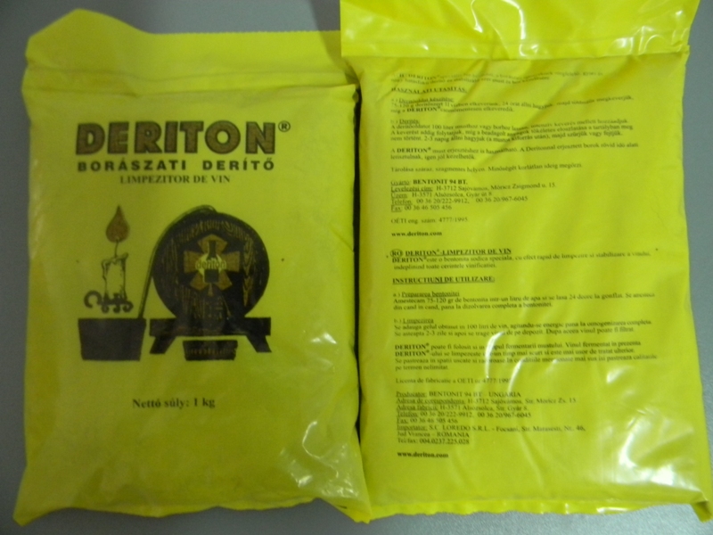 Deriton este o bentonita sodica speciala, cu efect rapid de limpezire si stabilizare a vinului indeplinind toate cerintele vinificatiei. Prepararea bentonitei pentru limpezirea unei cantitati de 100 litri de vin se face prin amestecarea energica a 75-120 grame de bentonita cu de 10 ori cantitatea de apa calda (1litru de apa la 100 grame bentonita) pana la omogenizarea completa. Solutia obtinuta se lasa la gonfiat timp de 24-48 ore amestecandu-se din cand in cand, rezultand un gel de consistenta uleiului alimentar. Se adauga gelul obtinut intr-o cantitate de 100 litri de vin, agitandu-se sau barbotandu-se energic timp de 10 minute (eventual in 2-3 reprize) pana la omogenizarea completa. Vinul trebuie sa aiba temperatura de peste 15°C pentru a se putea obtine o cat mai buna diluitie a bentonitei in masa lui. Dupa 3-4 saptamani vinul se poate trage de pe depozit avand grija ca acesta sa nu fie tulburat. Dupa aceasta operatie vinul poate fi filtrat. A se depozita in loc uscat si racoros.